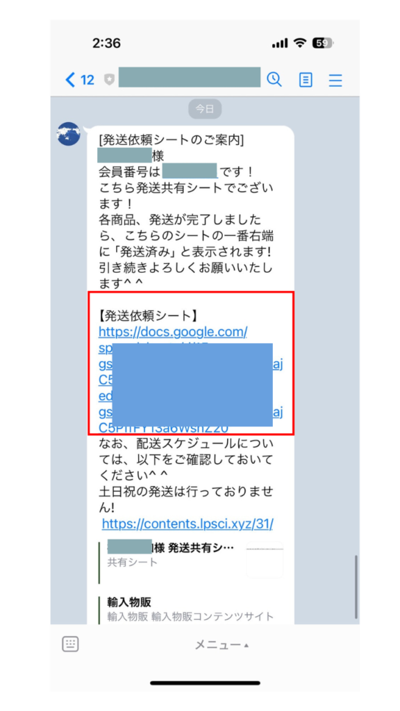 発送共有シートは、発行のご準備が出来次第サポートより画像のようなメッセージで、会員番号と一緒に送られます。