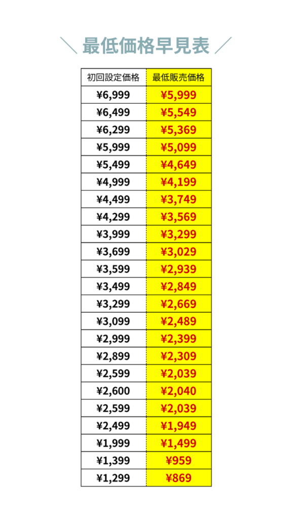 初回設定価格と最低販売価格の対応表を参考にお値段設定を行うと計算の手間が省けますので、ご活用ください。