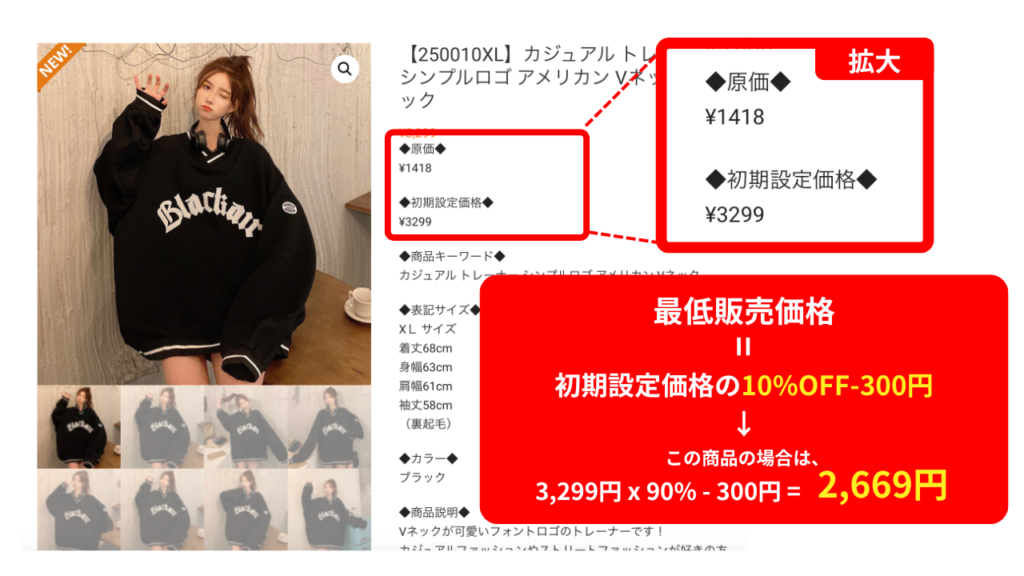 最低販売価格とは、弊社の物販ビジネスを行う上で「これ以上は値下げしないでね」という価格です。それぞれの商品ページに記載されている価格に対し10%オフ+300円引きまでの価格を下限とし、その価格を1円でも下回った場合は、売れても弊社から発送することができません。最低販売価格は必ず計算して、下回らないように値引きしていきましょう。